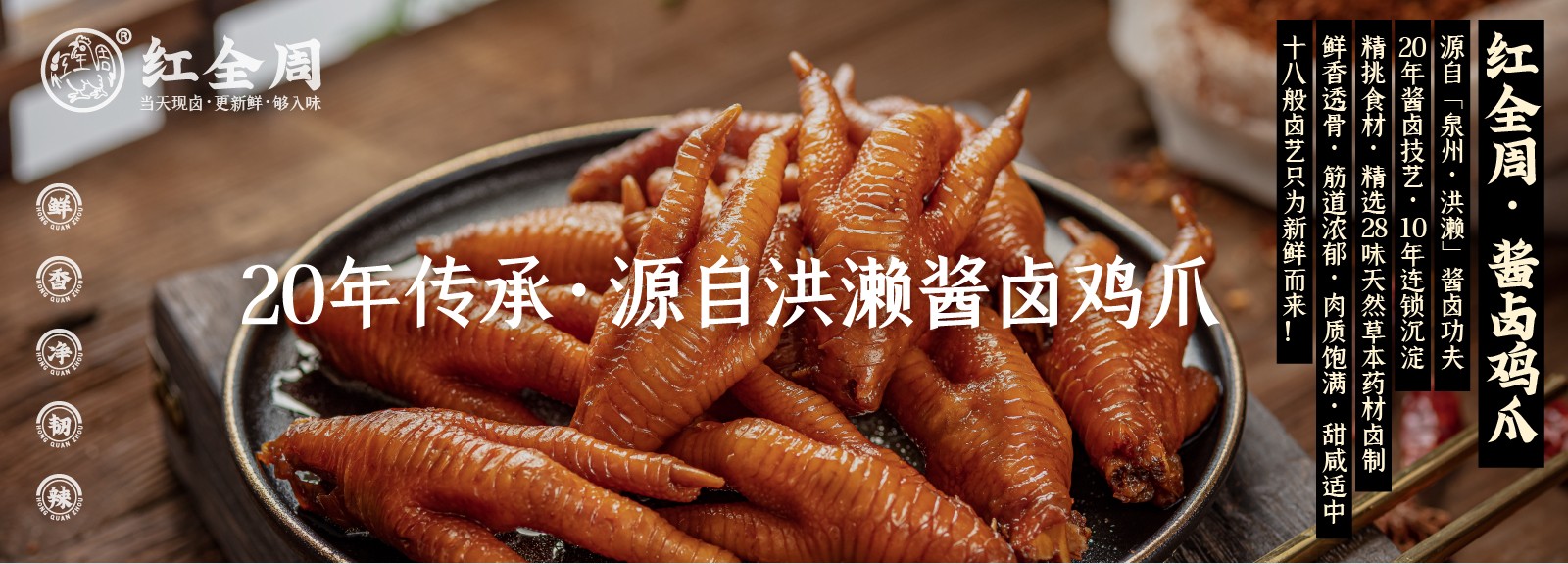 紅全周品牌創(chuàng)立于2012年,其生產(chǎn)總部坐落在以“紅全周雞爪”聞名的福建泉州市南安洪瀨鎮(zhèn),經(jīng)張福來(lái)師傅多年研制而成的獨(dú)家秘方,獨(dú)特的鹵制工藝,以“鮮、香、韌、辣”的特點(diǎn),贏得廣大食客的交口稱(chēng)贊。紅全周繼承中華美食傳統(tǒng),堅(jiān)持以“細(xì)微處見(jiàn)風(fēng)范,毫厘間定乾坤”的服務(wù)準(zhǔn)則,遵循現(xiàn)代健康飲食理念,精選上等食材,致力為消費(fèi)者提供安全、健康的美食新體驗(yàn)。